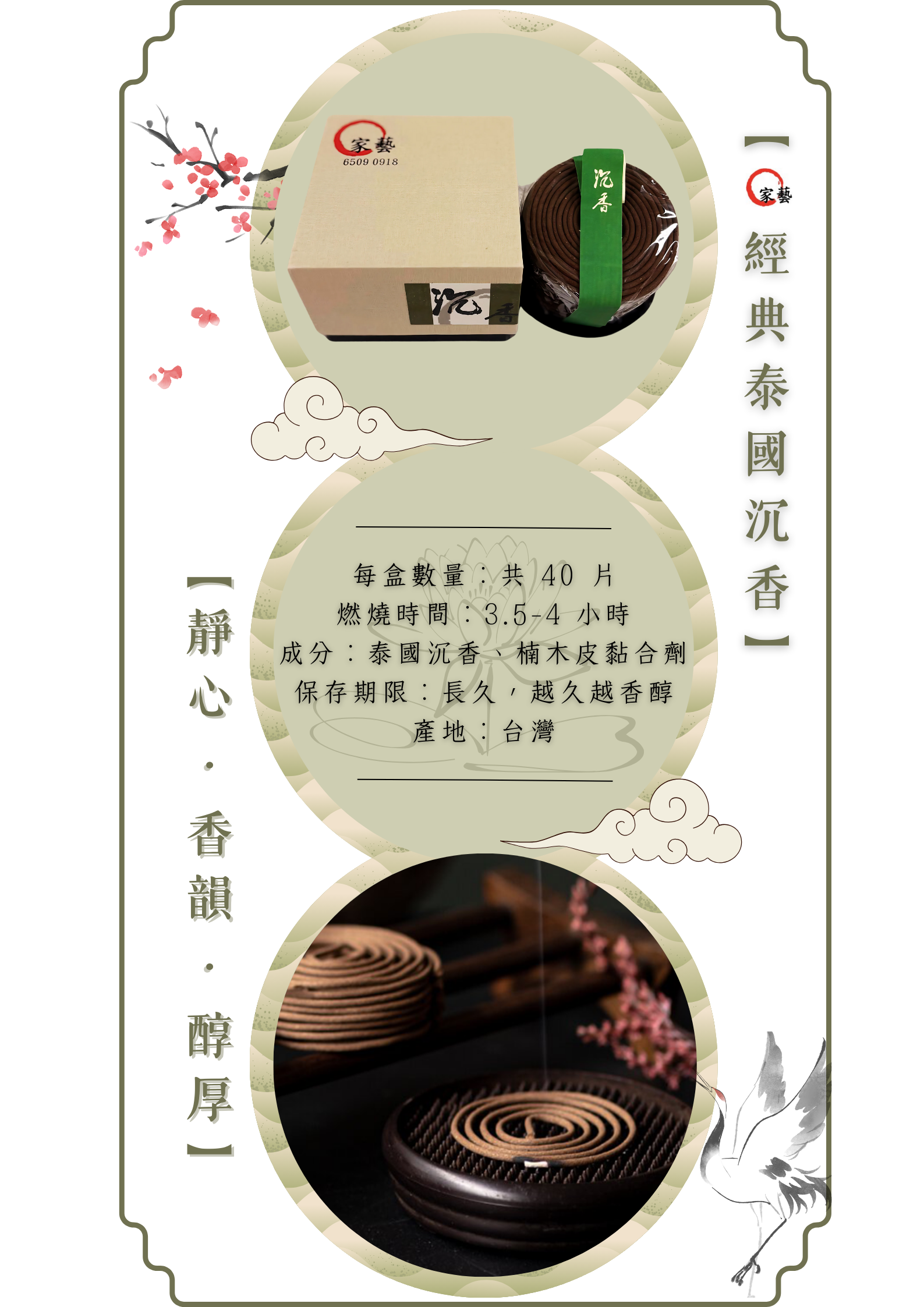 精選泰國沉香,手工古法制,以楠木皮粉天然黏合,台灣香廠製作。大片可燃約四小時,每盒四十片。香氣沉靜醇厚,適合冥想與空間靜心,且存放越久香韻越醇。日常版入門級高品質沉香,安神靜氣,禮佛自用,冥想瑜珈。 【3.5小時經典沉香】 燃燒時間:大片 3.5–4 小時 每盒數量:共 40 片 成分:泰國沉香、楠木皮黏合劑 產地:台灣製造 保存期限:長久,越久越香醇
